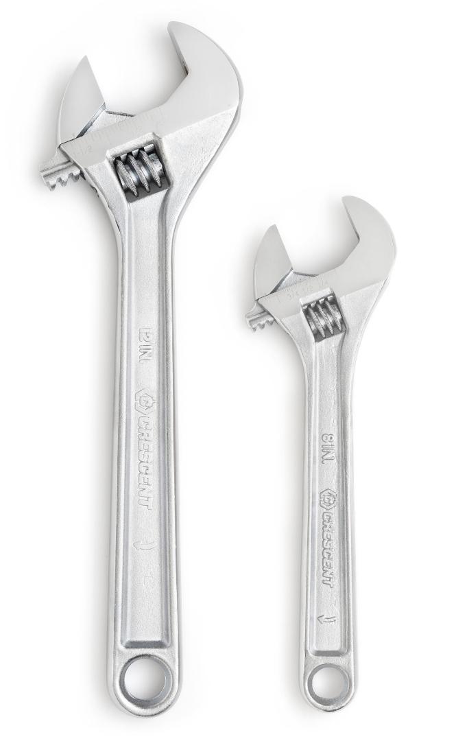 The Crescent 8-inch and 12-inch Adjustable Wrenches both feature a large knurl for easy adjustment and a tight jaw fit. Their hex jaw design helps reduce slippage and tightly grips the fastener for solid, secure operation, while the corrosion-resistant chrome finish helps prevent rusting. A wide handle design provides comfort and reduces fatigue during extended use, ideal for both pros and do-it-yourself enthusiasts.