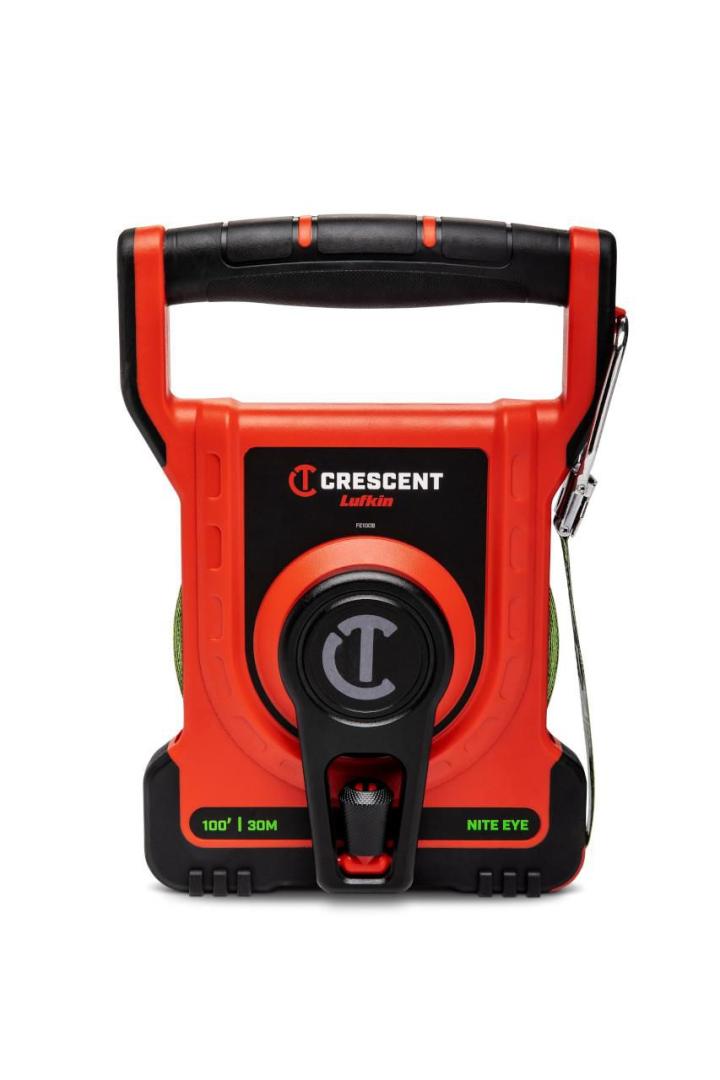 The Crescent 100'/30 m NITE EYE™ Fiberglass Long Tape features a double-sided high-contrast NITE EYE™ blade, ensuring visibility in all light conditions. The end hook is designed with a built-in storage dock, compatible with wood stakes and rebar. A 3-to-1 rewind will speed up retraction, eliminating the tedious process of rewinding a long tape. This all fits in a case that features a flat base allowing for placement on the ground improving balance and accuracy.