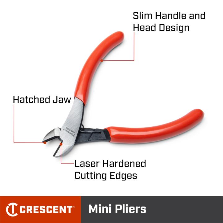 Frequently Asked QuestionsWhat would mini pliers be used for?Mini pliers are designed for tasks where precision is important and where access is limited. They're ideal for electronic repair, jewelry making, crafting, and more.What can I use diagonal cutting pliers for?They're used for cutting wire and small materials so they're commonly used by electricians, auto techs, & general handymen.What is the benefit of dipped handle slip joint pliers?Dipped handles are easy to clean and provide a durable layer that protect from wear and tear.Are diagonal cutting pliers called something else?Yes, they are called many different names. They are most commonly referred to as wire cutters, side cutters, dikes or dykes within the US electrical industry, and in the UK and Ireland, they're known as nippers.