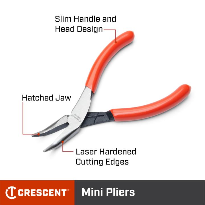 Frequently Asked QuestionsWhat would mini pliers be used for?Mini pliers are designed for tasks where precision is important and where access is limited. They're ideal for electronic repair, jewelry making, crafting, and more.What would I use bent nose pliers for?Bent nose pliers have angled jaws that provide added control and precision. They're commonly used in general repairs, electrical work, jewelry making, auto repairs, and more.What is the benefit of dipped handle slip joint pliers?Dipped handles are easy to clean and provide a durable layer that protect from wear and tear.