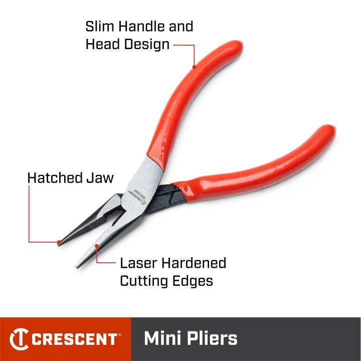 Frequently Asked QuestionsWhat would mini pliers be used for?Mini pliers are designed for tasks where precision is important and where access is limited. They're ideal for electronic repair, jewelry making, crafting, and more.What tasks should I use a long nose plier for?Long nose pliers are commonly used in electrical work to bend, twist, and cut wires. They're also used for general repairs, jewelry making, automotive repairs, and more.What is the benefit of dipped handle slip joint pliers?Dipped handles are easy to clean and provide a durable layer that protect from wear and tear.Is there a difference between long nose and needle nose pliers?They are similar but they are slightly different. Needle nose pliers have more narrow and pointed jaws.