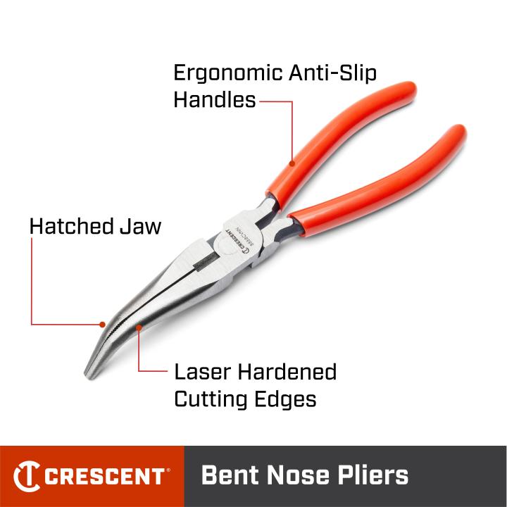 Frequently Asked QuestionsWhat would I use bent nose pliers for?Bent nose pliers have angled jaws that provide added control and precision. They're commonly used in general repairs, electrical work, jewelry making, auto repairs, and more.What is the benefit of dipped handle slip joint pliers?Dipped handles are easy to clean and provide a durable layer that protect from wear and tear.Does Crescent offer a warranty on their pliers?Check out our warranty policy at www.crescenttool.com/warranty or contact our dedicated Customer Service team at 877-626-3433.