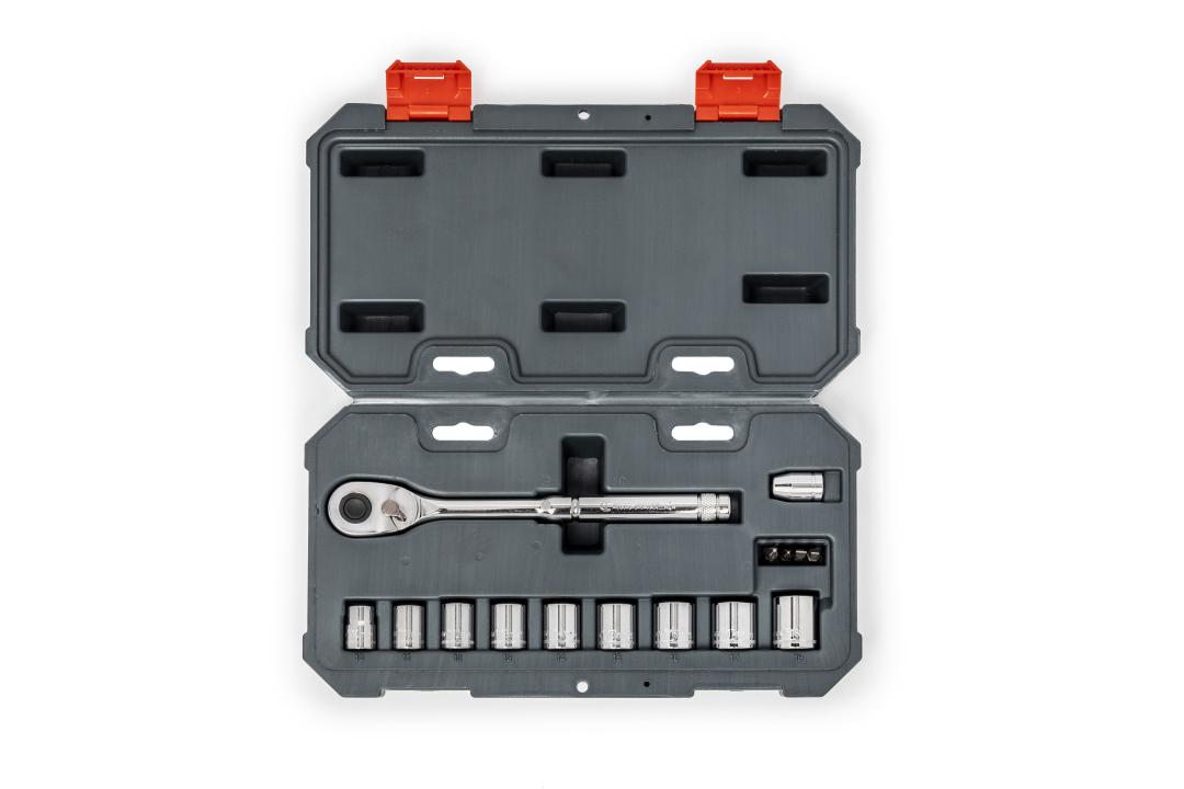 The Crescent 15 piece 3/8” drive metric mechanics tool set contains a heavy duty 72 tooth 3/8” drive quick release ratchet, allowing for quick socket exchanges and a compact head design allowing for access to more fasteners. The sets 6 point metric shallow depth sockets feature off-corner loading technology virtually eliminate fastener rounding and feature stamped size markings for easy identification. Packed in a heavy duty blow mold case, protects set contents and easy to transport.