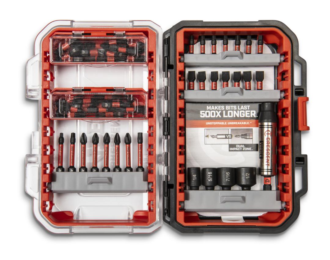 The Crescent 55 PC VORTEX(TM) Impact Driver Bit alphaCASE (TM) Set includes the patented Crescent VORTEX Bit Holder (TM) and VORTEX bits. The VORTEX Bit Holder (TM) features an exclusive Dual Impact Torsion Zone (TM) that absorbs shock, which prevents stripping screws and extends bit life. Compatible with 1/4" hex shank impact drivers and drills, the Crescent Vortex Bit Holder withstands heavy use in impact applications and prevents over-torquing of fasteners. This set also contains the Crescent VORTEX™ Fastening bits, featuring optimized tip geometry that increases fastener retention and reduces cam-out. The VORTEX (TM) bits torsion zone design delivers maximum performance in impact applications and provides extended bit life from its unique steel formulation and proprietary heat treat process. Each bit comes designed with laser etched size markings, which provide ease of identification. This alphaCASE™ set offers superior versatility and customization with pivoting, detachable rails for ease of use and organization. Its superior durability allows it to withstand heavy use on the toughest jobsites, making it a must-have accessory storage solution.
