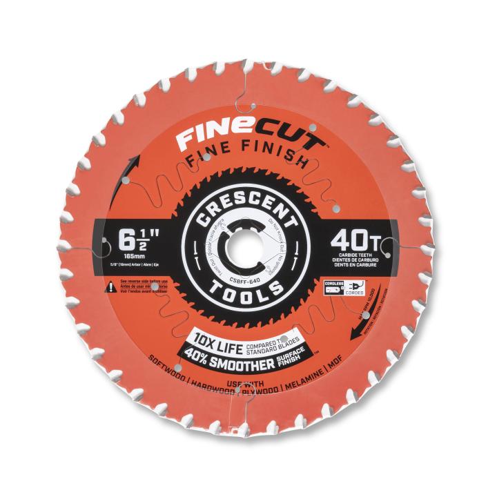 Crescent's FineCut™ Finishing Blades deliver quality cutting performance for a superior finish over the life of the blade. Premium precision carbide teeth slice through wood with ease delivering 10X life for maximum productivity. An ultra-thin kerf design provides less tear-out, while Active Shield™ non-stick blade coating protects against heat, gumming and corrosion delivering a 40% smoother surface finish for less sanding. Laser cut vibration and expansion slots create a more balanced blade for greater durability and accuracy.