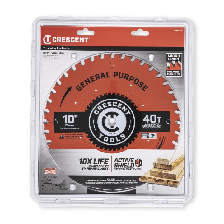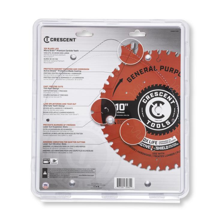 Crescent's General Purpose Blades deliver quality cutting performance for tough demands on the jobsite. Premium Micro Grain™ carbide teeth slice through wood with ease delivering 10X life for maximum productivity. A thin kerf design provides faster cutting performance, while Active Shield™ non-stick blade coating protects against heat and gumming for less drag. Laser cut vibration and expansion slots create a more balanced blade for greater durability and cutting efficiency.