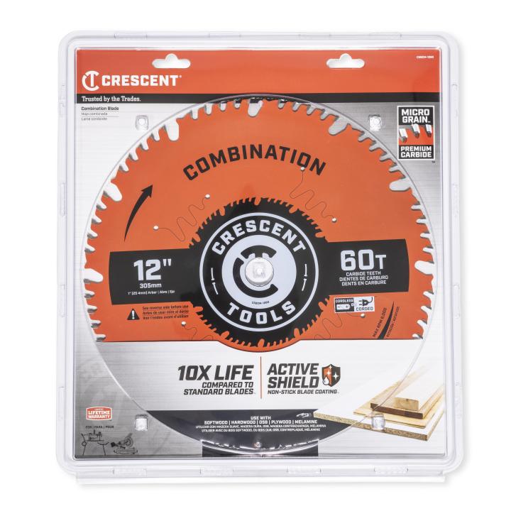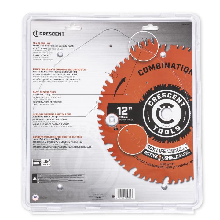Crescent's Combination Blades deliver quality cutting performance for tough demands on the jobsite. Premium Micro Grain™ carbide teeth slice through wood with ease delivering 10X life for maximum productivity. A thin kerf design provides clean cutting performance, while Active Shield™ non-stick blade coating protects against heat and gumming for less drag. Laser cut vibration and expansion slots create a more balanced blade for greater durability and cutting efficiency.