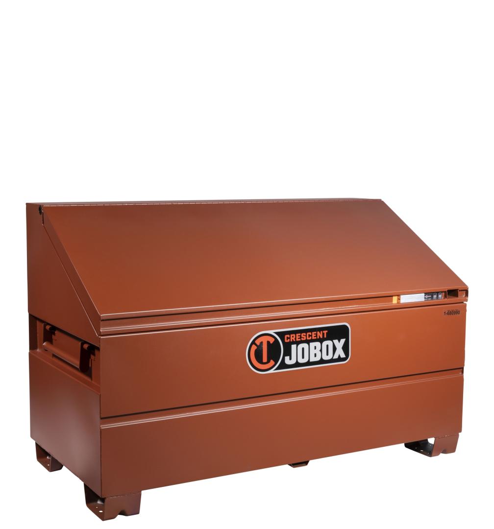 Frequently Asked QuestionsWhat are the dimensions of this Crescent JOBOX Slope Lid Chest?This Crescent Slope Lid Chest is 60" deep, 30" wide, and 39.5" tall.What's the benefit of the Locking Lid feature?The lid support rod props up to create a flat surface with the lid of the chest. This creates the perfect workspace while on the jobsite.Is there a warranty?Yes, they are covered by our No B.S. 1 year warranty policy. Fill out our warranty replacement form online or reach out to our Customer Service team at 1-800-643-0084