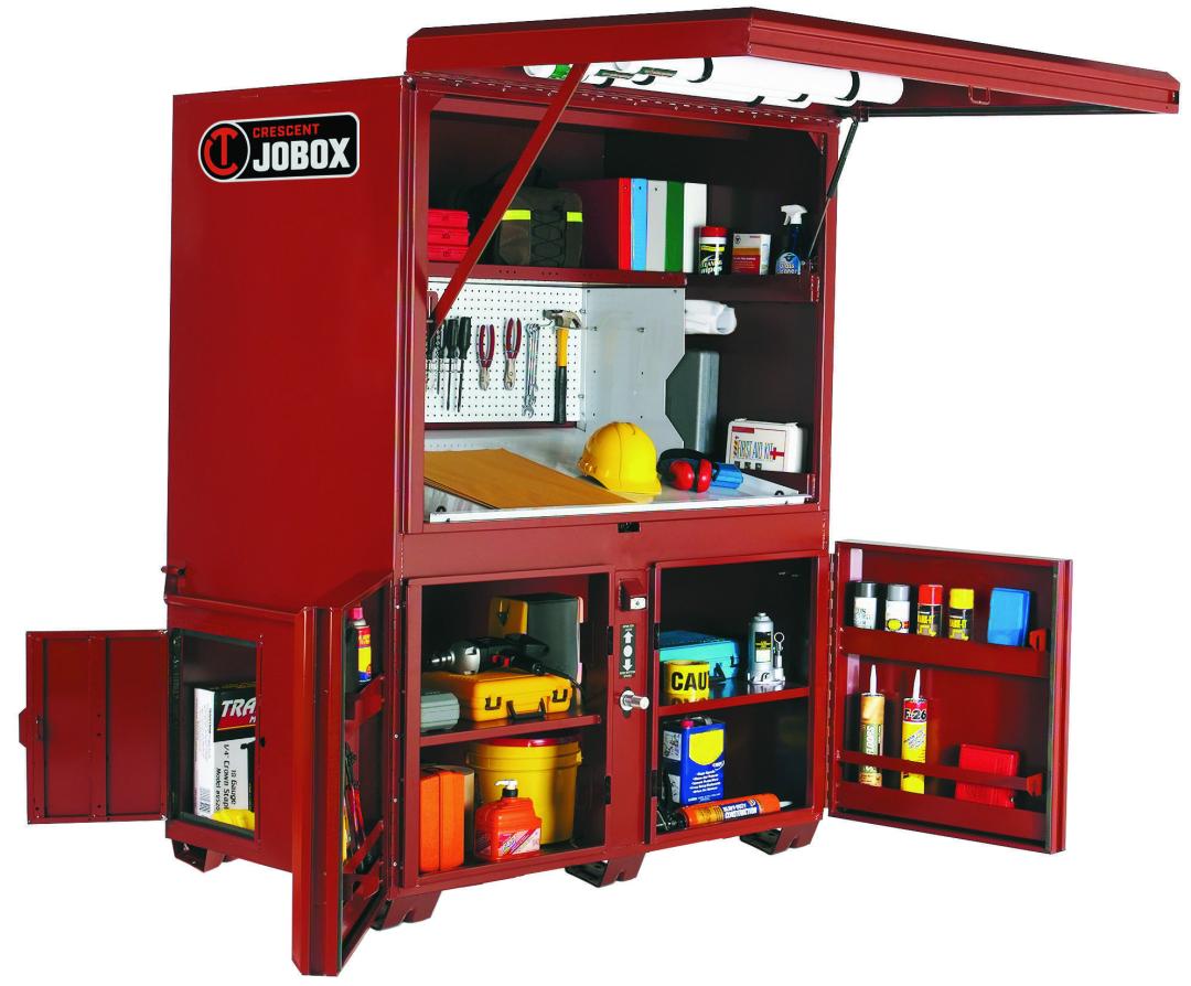 Frequently Asked QuestionsHow secure is the Crescent JOBOX Field Office?It features a large lockable desktop, a 30 foot lockable storage locker, and a heavy-duty one handle lock to keep all of your things locked away on the jobsite.What materials are used to construct this?The Crescent JOBOX Field Office is made of out heavy duty steel with a powder coating finish. It includes beveled sidewalls for enhanced weather protection, stainless steel door hinges to prevent rust, and 10-gauge high-tensile alloy steel bolsters with holes to install optional casters.Is there a warranty?Yes, they are covered by our No B.S. 1 year warranty policy. Reach out to our Customer Service team at 1-800-643-0084 or Customer.Service@apextoolgroup.com