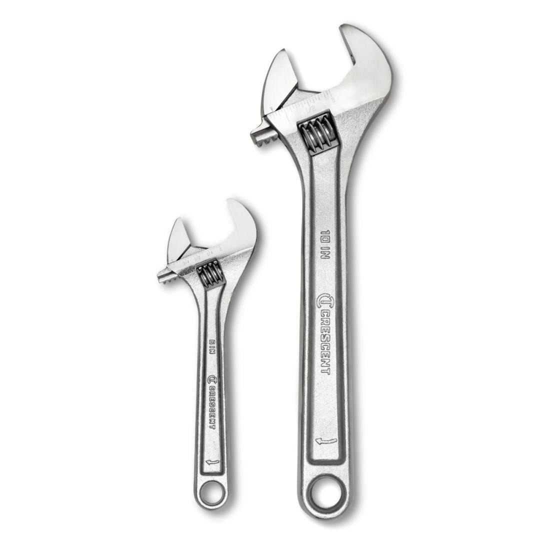 The Crescent 6-inch and 10-inch Adjustable Wrenches both feature a large knurl for easy adjustment and a tight jaw fit. Their hex jaw design helps reduce slippage and tightly grips the fastener for solid, secure operation, while the corrosion-resistant chrome finish helps prevent rusting. A wide handle design provides comfort and reduces fatigue during extended use, ideal for both pros and do-it-yourself enthusiasts.